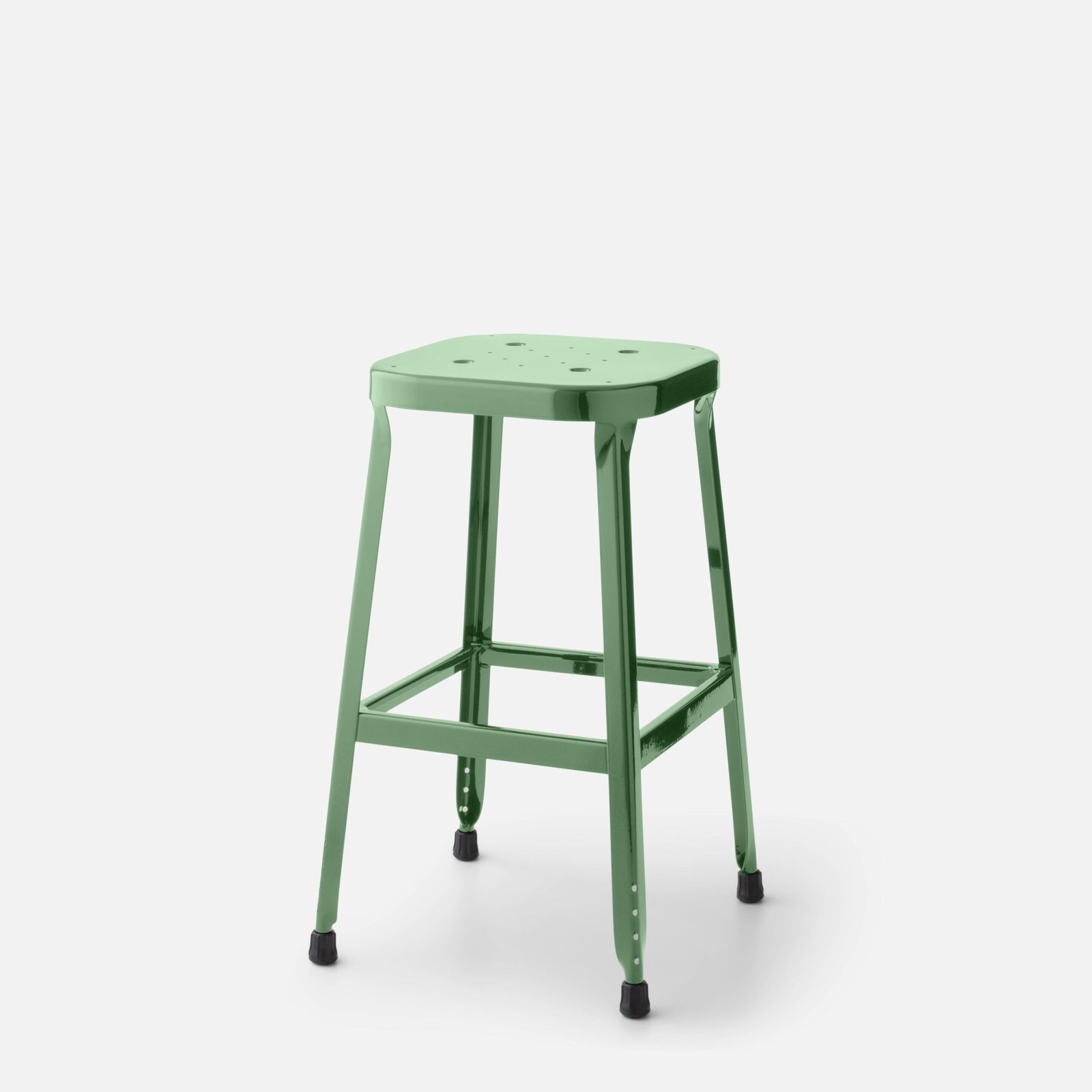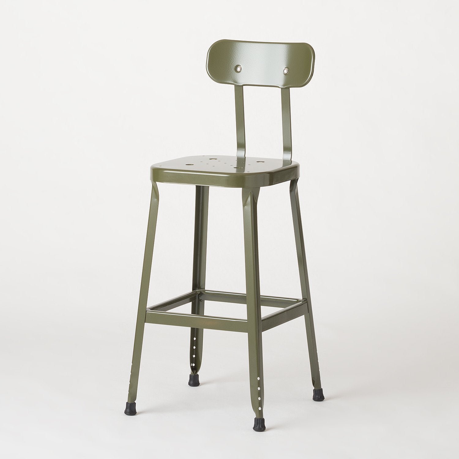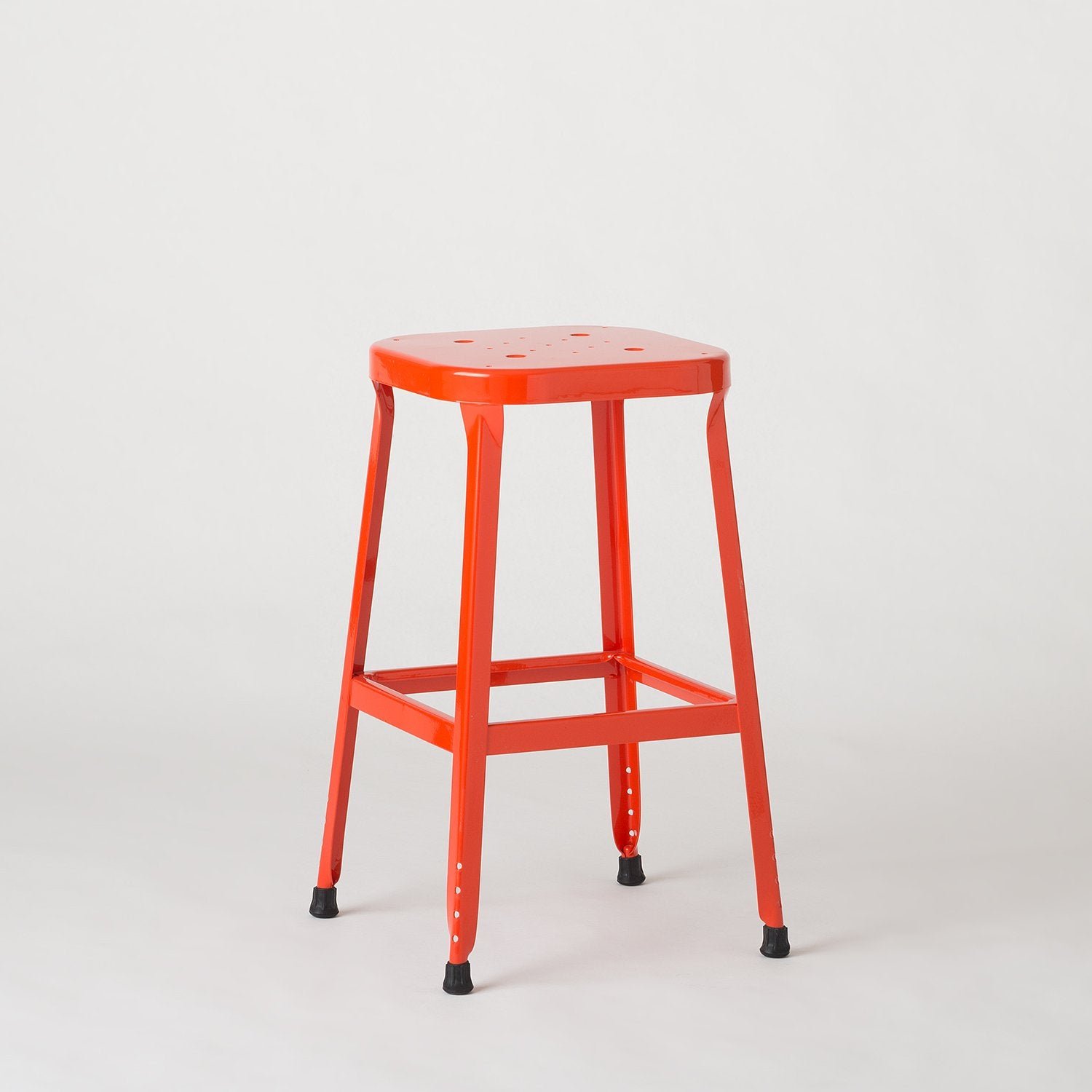 Built to last, this industrial-strength welded steel stool is ready to be put to work in any room of the house. An update of a classic, the design prioritizes comfort with an ergonomic stamped seat and molded backrest. Rubber feet help protect floors and resist skidding. Embossed with our iconic Hapindecor mark and available in a variety of finishes. A Hapindecor Original.