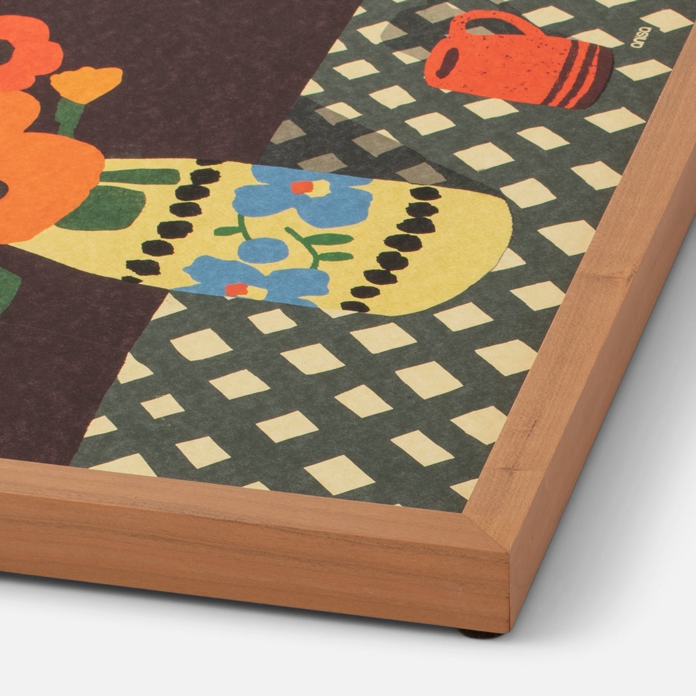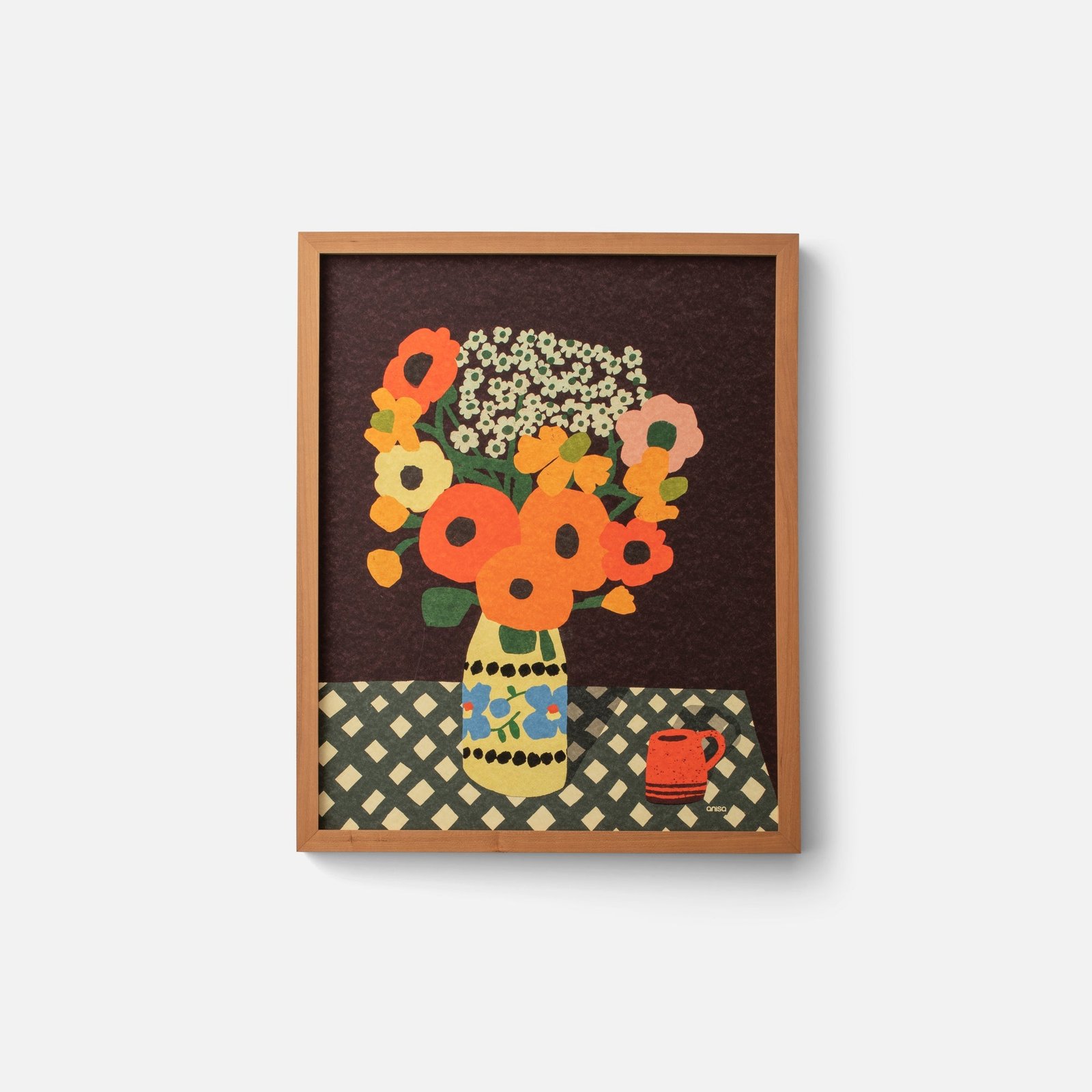 Inspired by the charm of a quiet tea moment, this vibrant print by Portland artist Anisa Makhoul brings bold, lively color to any space. A bouquet of bright, eye-catching flowers fills an ornate vase, set against a striking black background. The checkered tablecloth and red mug add a playful, nostalgic element that makes this piece feel both inviting and timeless.